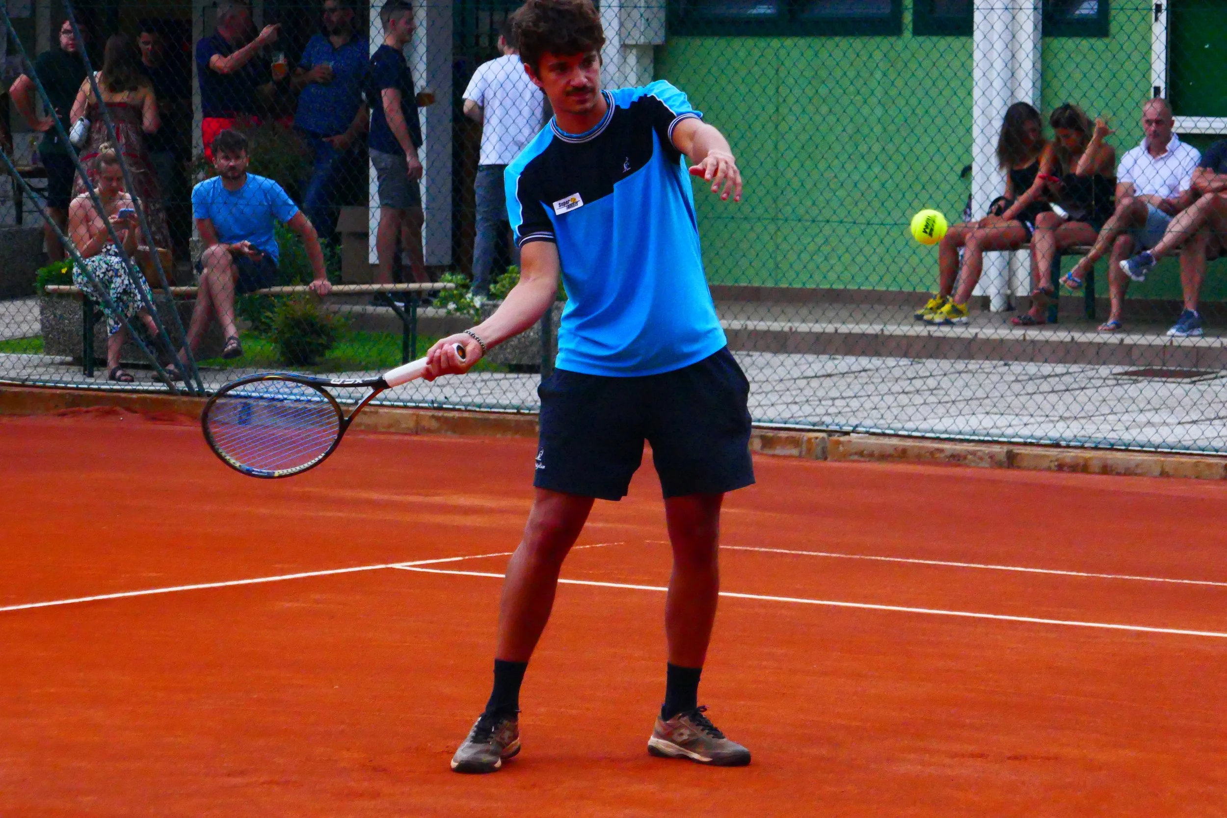 Salta per 6-4 6-2 la prima testa di serie Carlo De Nardi del Park Tennis Treviso per mano del ritrovato giuliano Gianluca Grison, imitato al lato opposto dal gradese Matteo Turci, implacabile nello stendere per 6-0 6-2 Angelo Rossi dell'Eurosporting Treviso. Così, al posto della prevista sfida per il titolo tra due giocatori della Marca, il titolo corre sulla direttrice territoriale Trieste-Gorizia. Parte a razzo il 26enne portacolori dell'At Opicina che sale con disinvoltura sul 3-0 con un dritto preciso e ricercato in ogni metro del campo, colpo che in fase di avanzamento sa di inesorabile sentenza. Non molla la presa l'istruttore del River Sporting Club di Cervignano: pareggia i conti in crescente fiducia, gioco vario, gambe reattive e, sostenuto da un servizio ficcante s'invola sul 6-4.